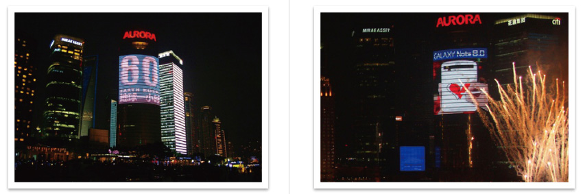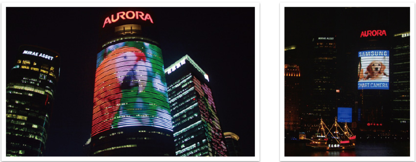 先后在“震旦大屏幕”发布广告的有:可口可乐、日本京瓷、宝马汽车、雷达表、德夫、汇丰银行、建设银行、中信银行、光大银行、保时捷、