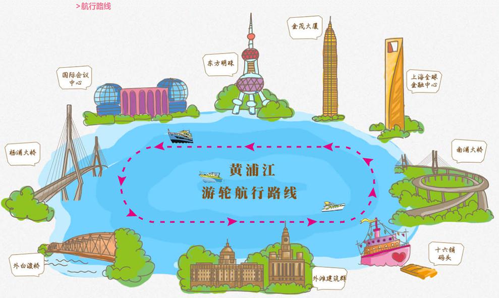 十六铺码头 — 秦皇岛路码头 (全程50分钟)乘船游览,途经外滩万国建筑博览群、陆家嘴金融贸易区、苏州河、国际客运中心等。可欣赏到外滩上一幢幢风格迥异充满浓郁异国色