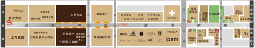 PRADA、BOSS、等一线品牌旗舰店,相邻与百盛淮海店与巴黎春天淮海店,各类奢侈品聚集的优越地理位置。此点位庞大客流及车流量。周边还分布