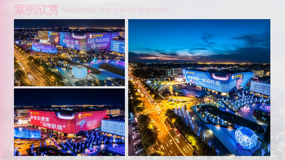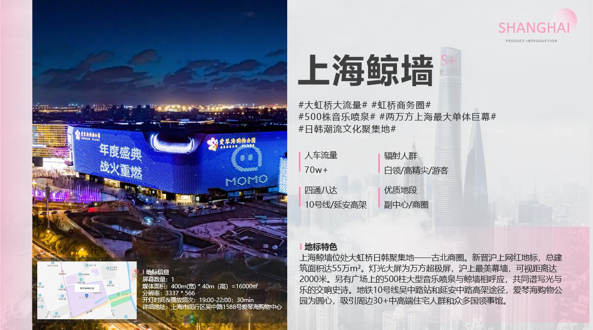 上海鲸墙位处大虹桥日韩聚集地——古北商圈。新晋沪上网红地标,总建筑面积达55万m²。灯光大屏为万方超极屏,沪上最美幕墙,可视距离达2000米。