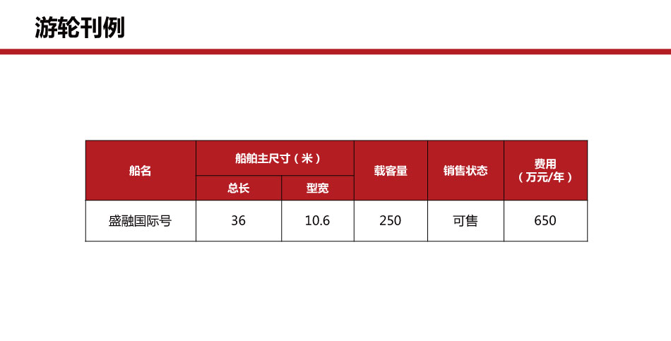 | 船名 | 船体主尺寸(米) | 载客量 | 销售状态 | 费用(万元/年) | |