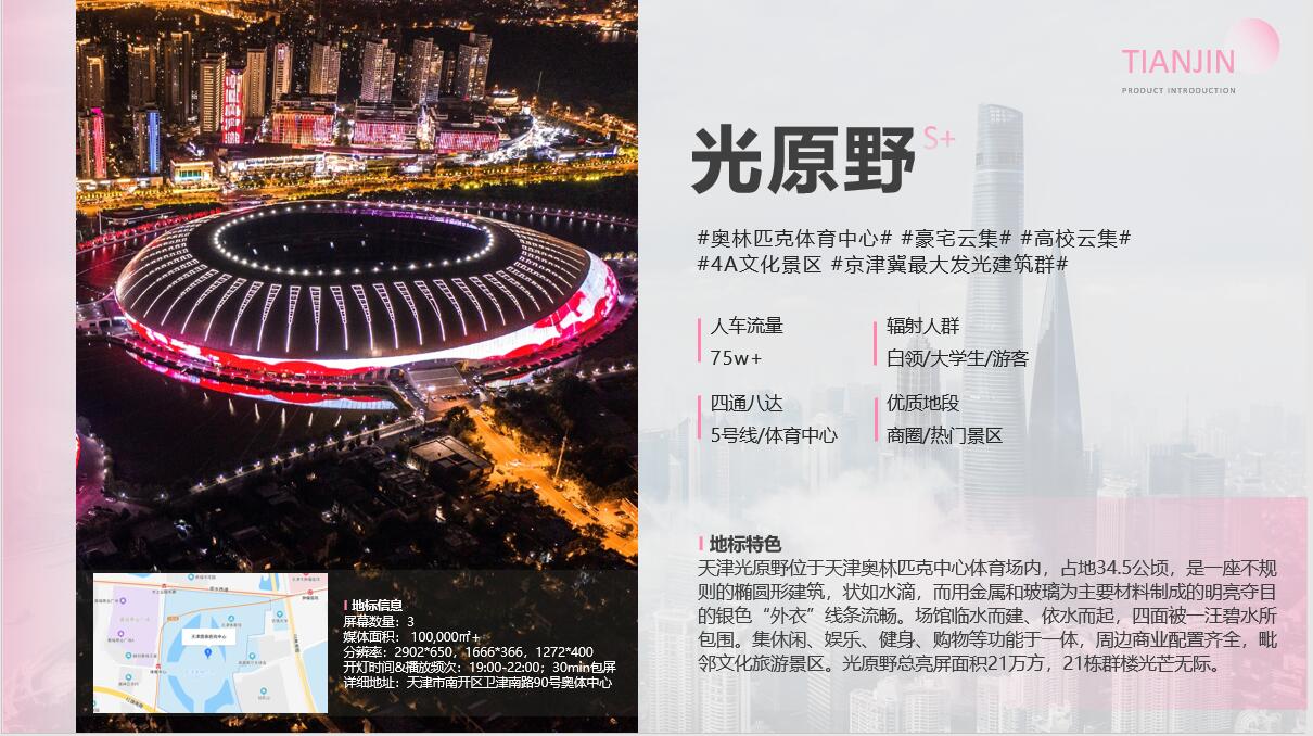 天津光原野位于天津奥林匹克中心体育场内,占地34.5公顷,是一座不规则的椭圆形建筑,状如水滴,而用金属和玻璃为主要材料制成的