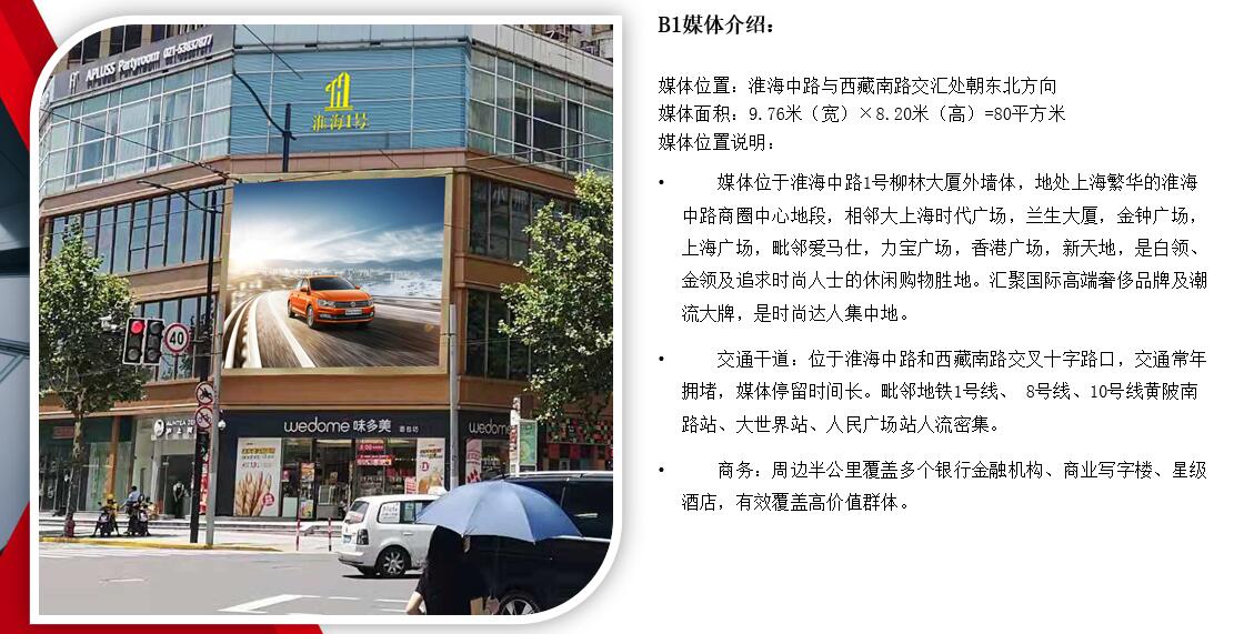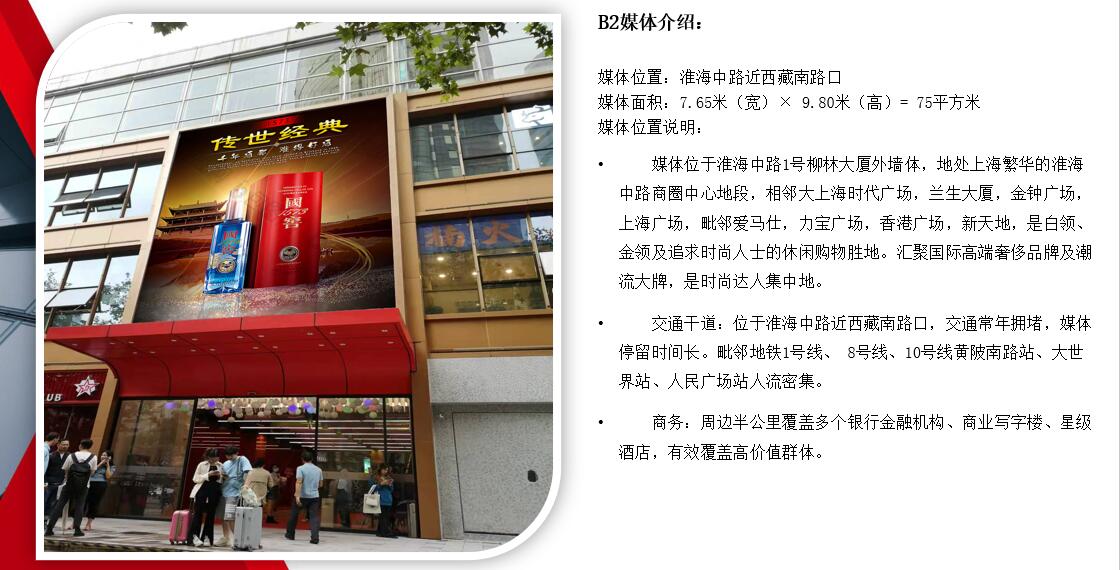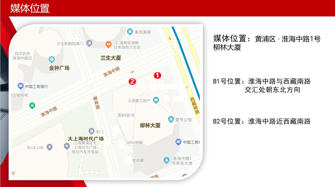 • 媒体位于淮海中路1号柳林大厦外墙体,地处上海繁华的淮海中路商圈中心地段,相邻大上海时代广场,兰
