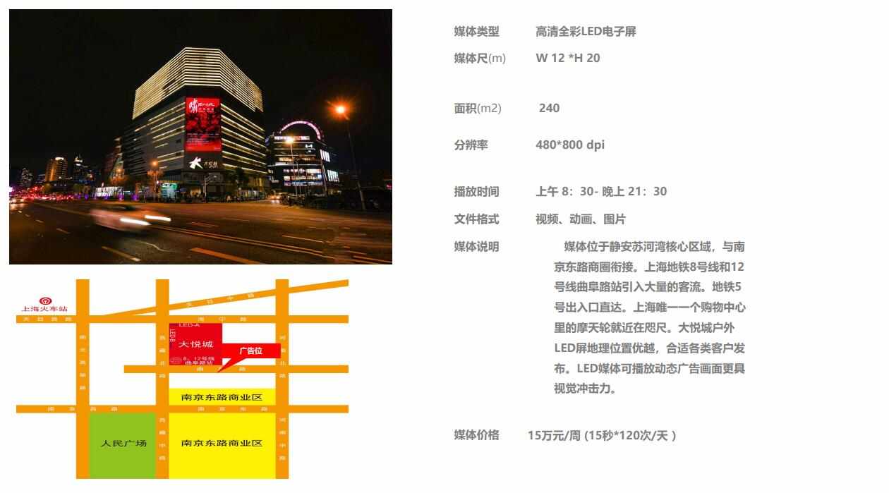 上海唯一—个购物中心里的摩天轮就近在咫尺。大悦城户外LED屏地理位置优越,合适各类客户发布。LED媒体可播放动态广告画面更具视觉冲击力。
